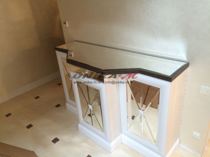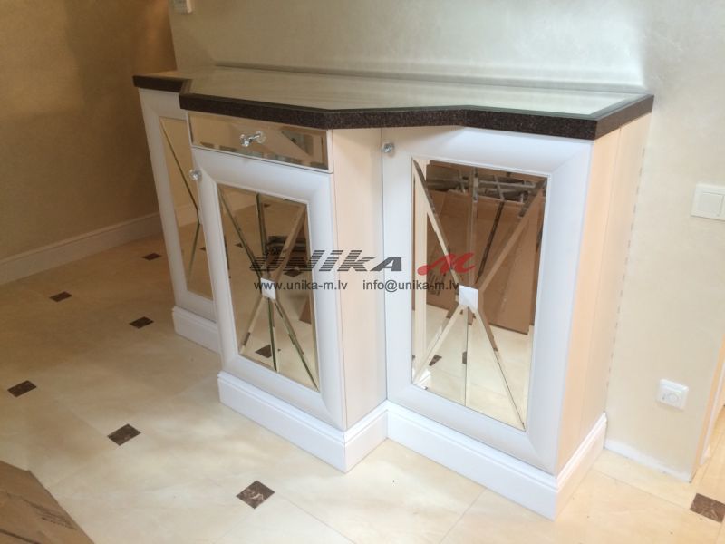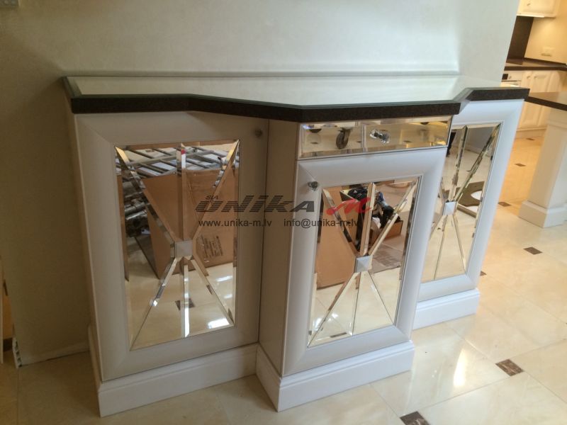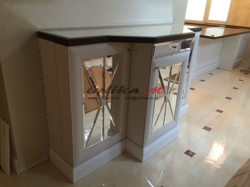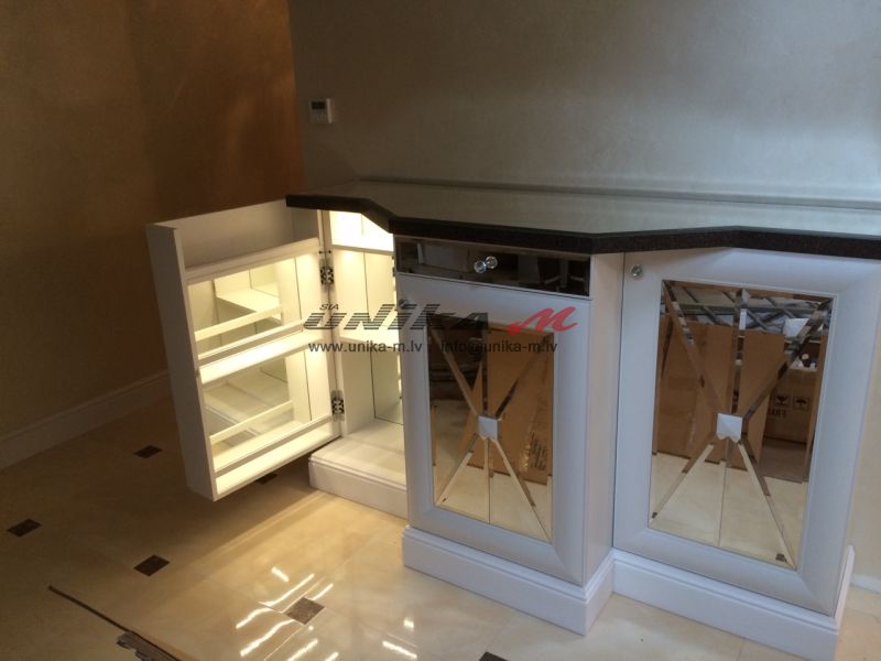 Īpaši efektīgs ir bāra dekors – spogulis ar slīpinātu malu, spoguļveida darba virsma, apdarināta ar mākslīgo akmeni koreānu, un rokturi, kas izrotāti Swarowski kristāliem.