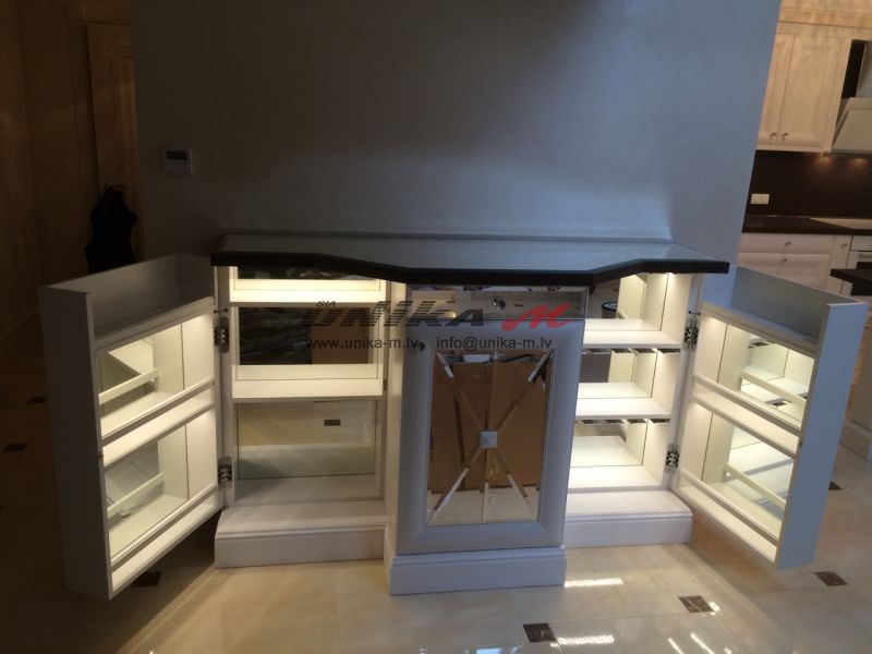 Bāra trīs daļas ir labi pārdomātas. Bāra centrālajā daļa ievietots ledusskapis vīniem. Ērtības labad šeit atrodas arī kaste. Klasiskajā stilā veidotā mēbele ir ietilpīga un ir lielisks ikviena interjera rotājums. Bāra malējās daļās ir spoguļu siena un to vēl efektīgāku padara piemērotais LED apgaismojums.